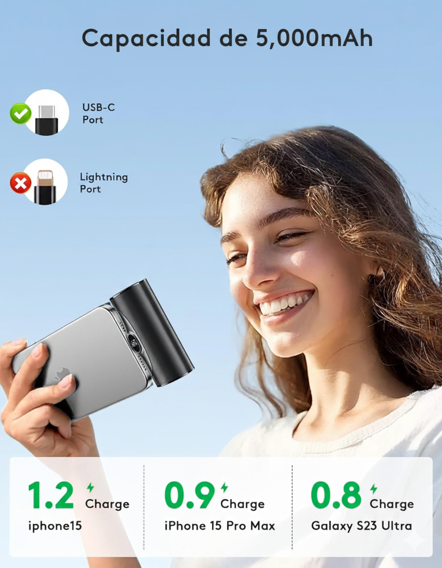 Dile adiós a las baterías descargadas y a los cargadores voluminosos. Consigue hoy mismo tu cargador portátil ultracompacto y mantente siempre con energía, dondequiera que vayas.